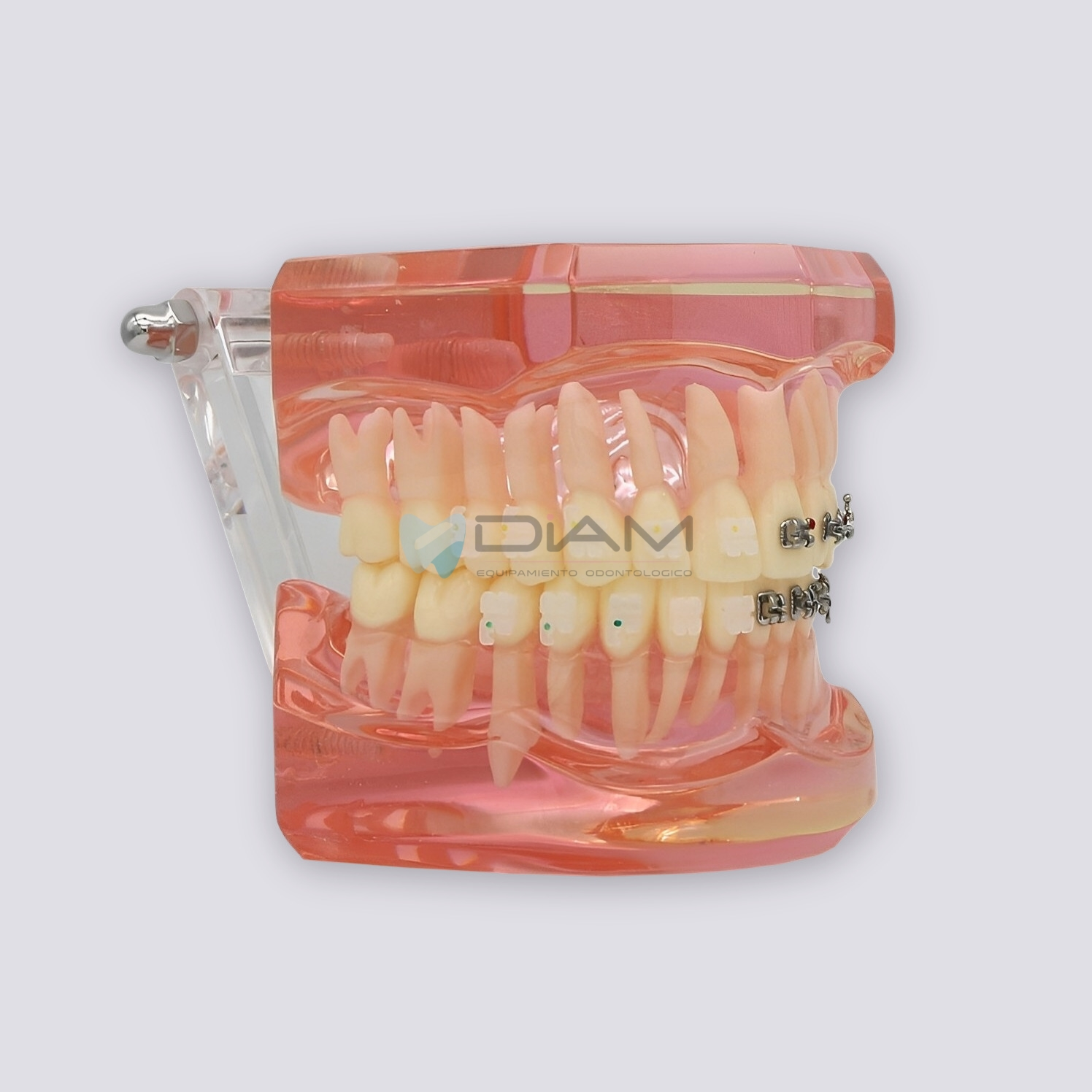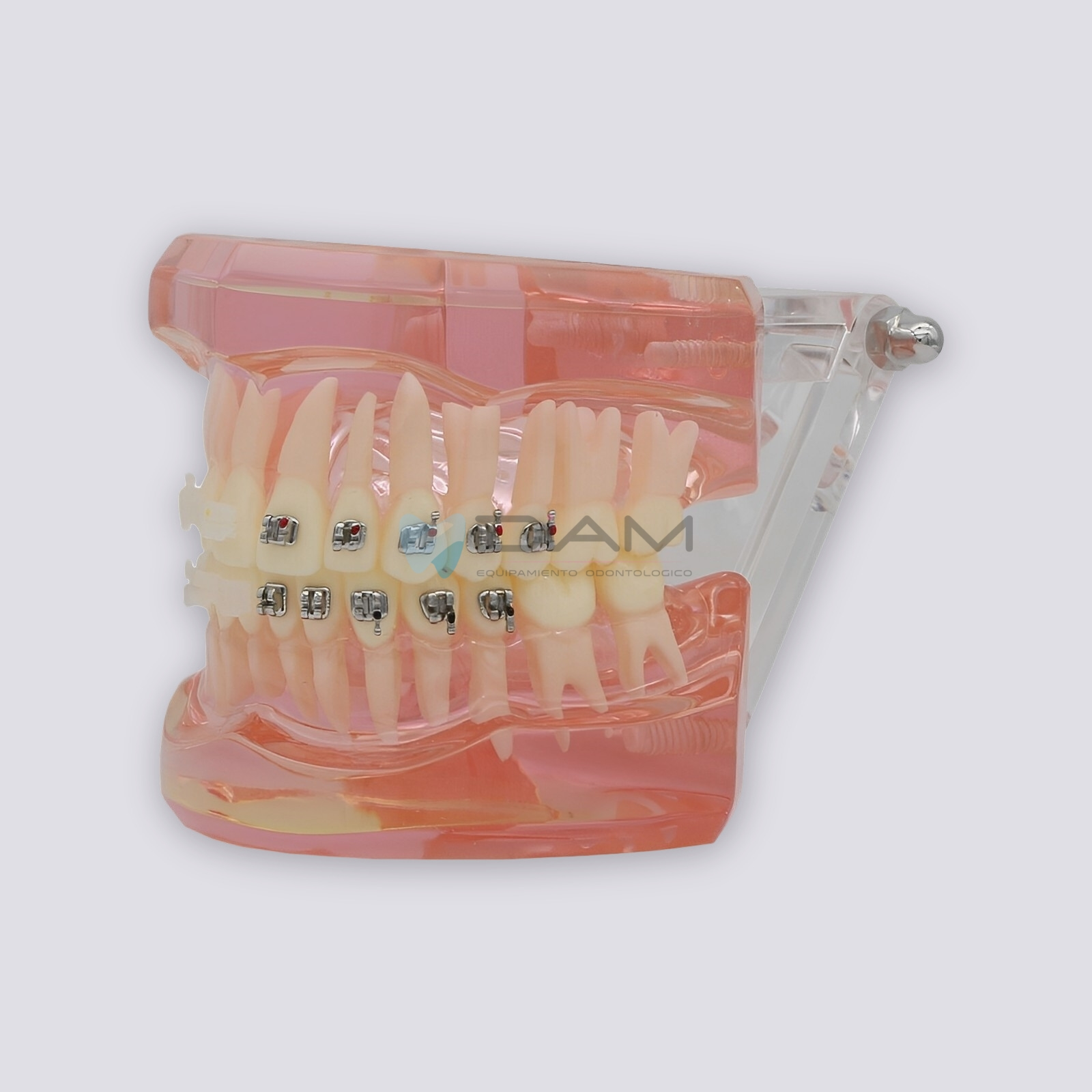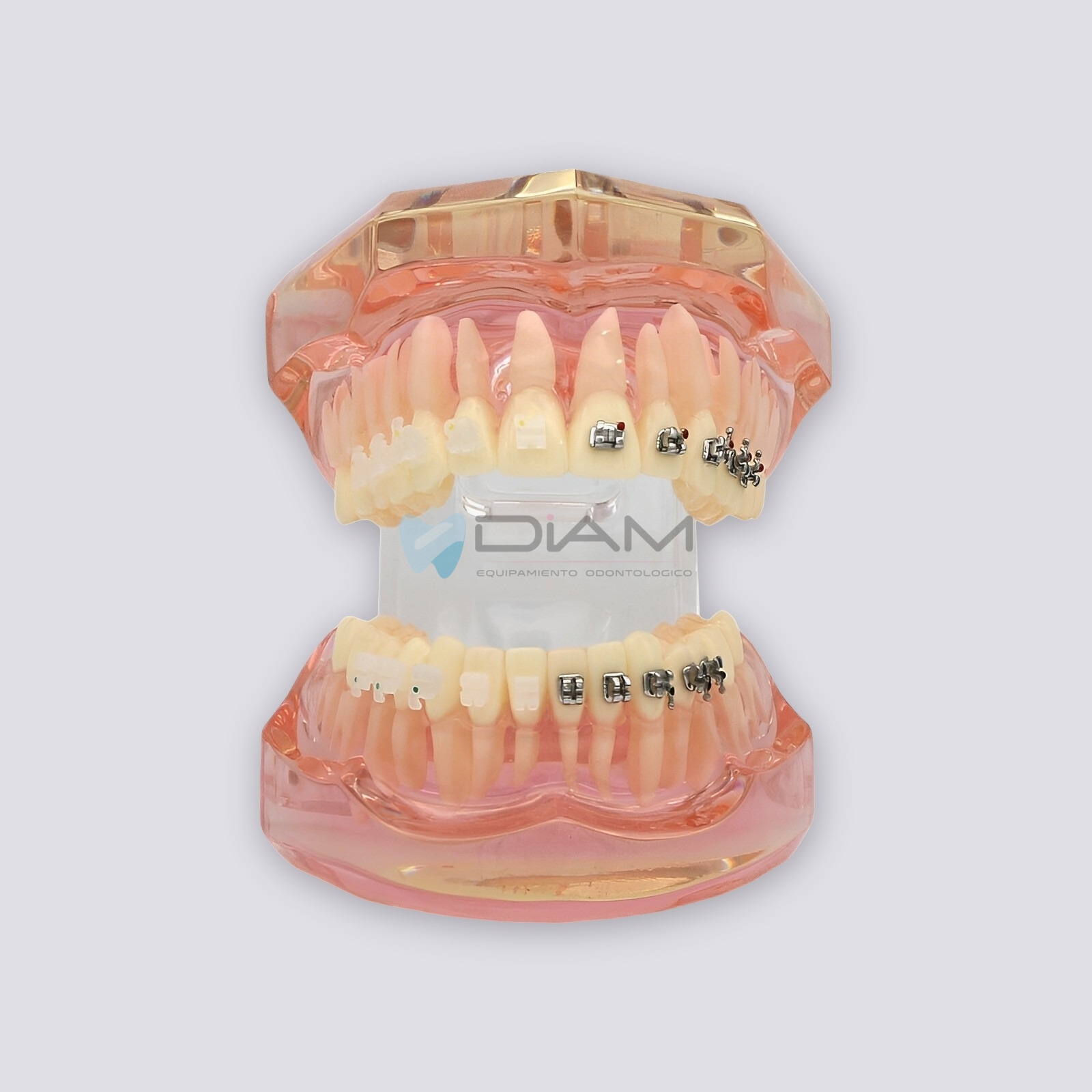 Modelo de ortodoncia de 28 piezas, muestra el efecto después del tratamiento de ortodoncia. Con Brackets mitad metal y mitad cerámico